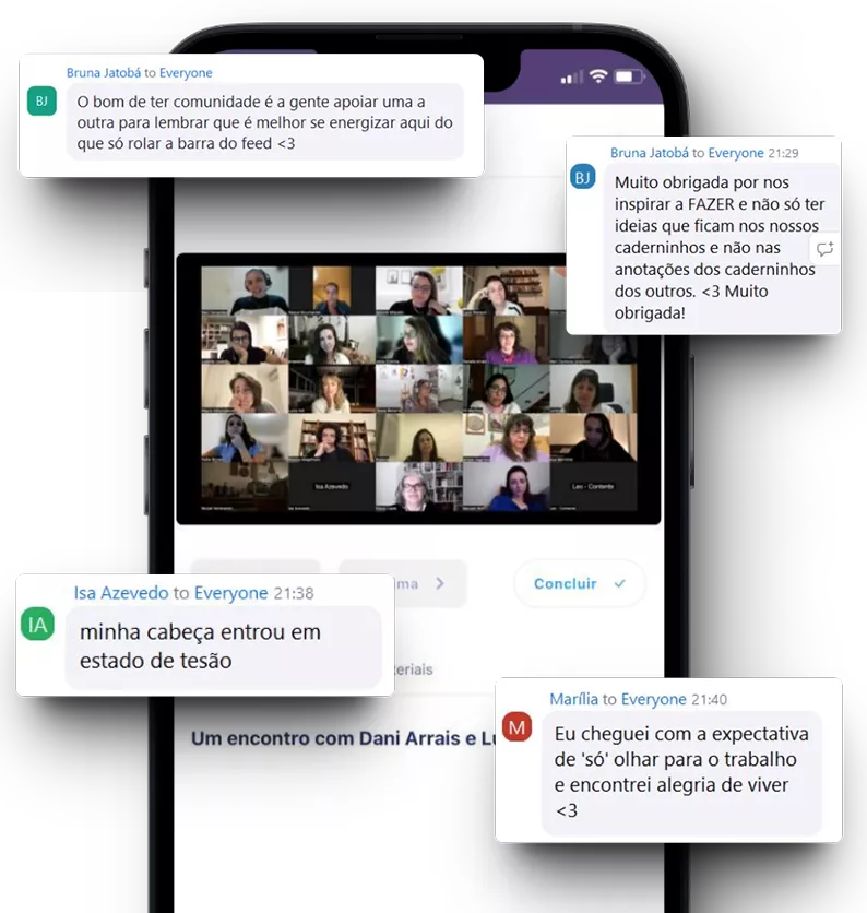 Espaços exclusivos de bate-papo em um ambiente seguro, longe da urgência das redes sociais e com todo suporte da Contente para trocas, networking, divulgação do seu trabalho, conexão com pessoas incríveis, apoio mútuo, possibilidades de colaborar com a Contente e muito mais.